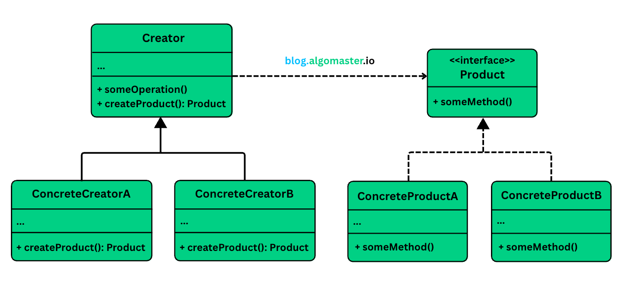 ConcreteCreator (e.g., EmailNotificationCreator, SMSNotificationCreator): Subclasses that override the factory method to return an instance of a specific ConcreteProduct.